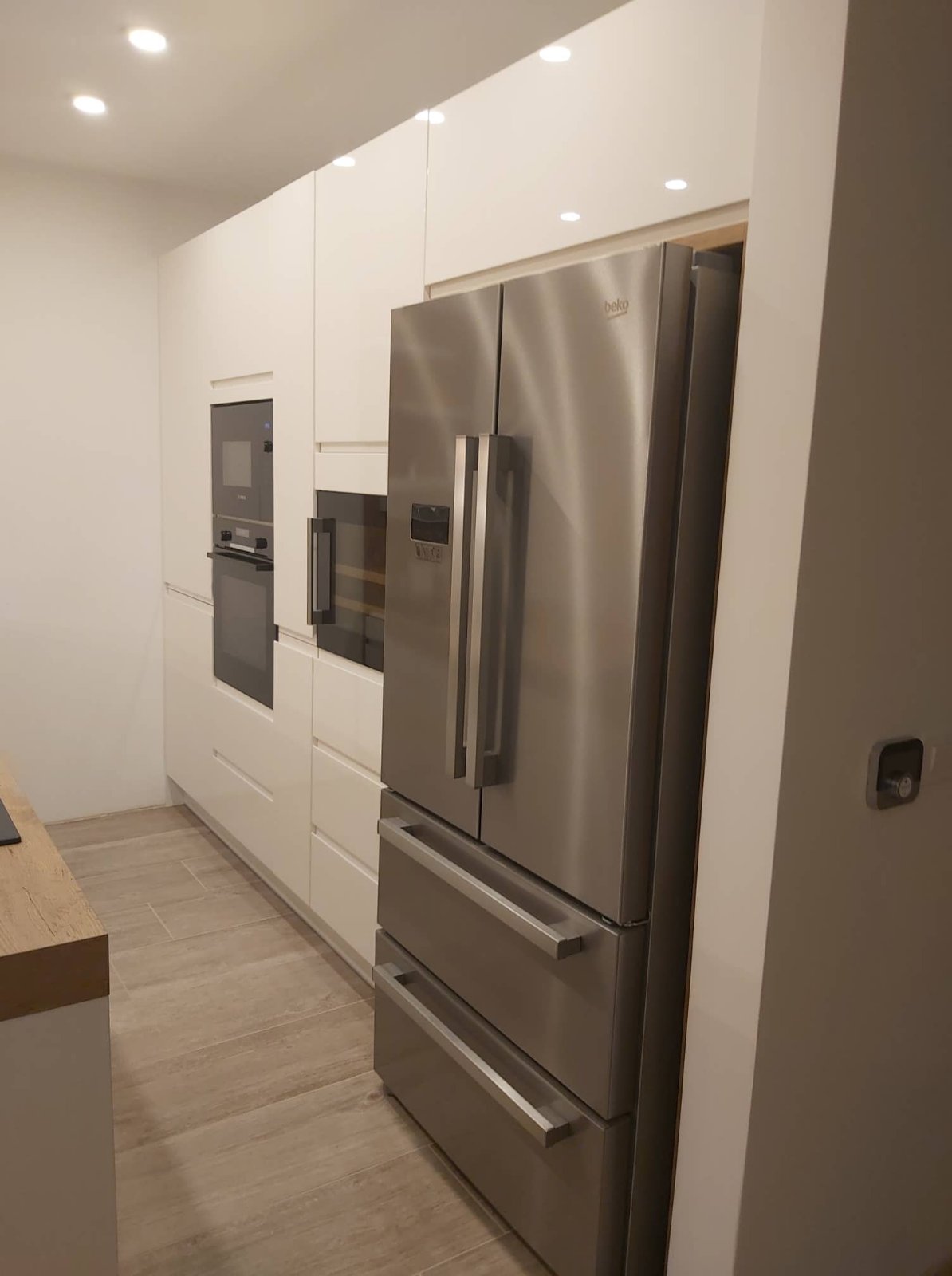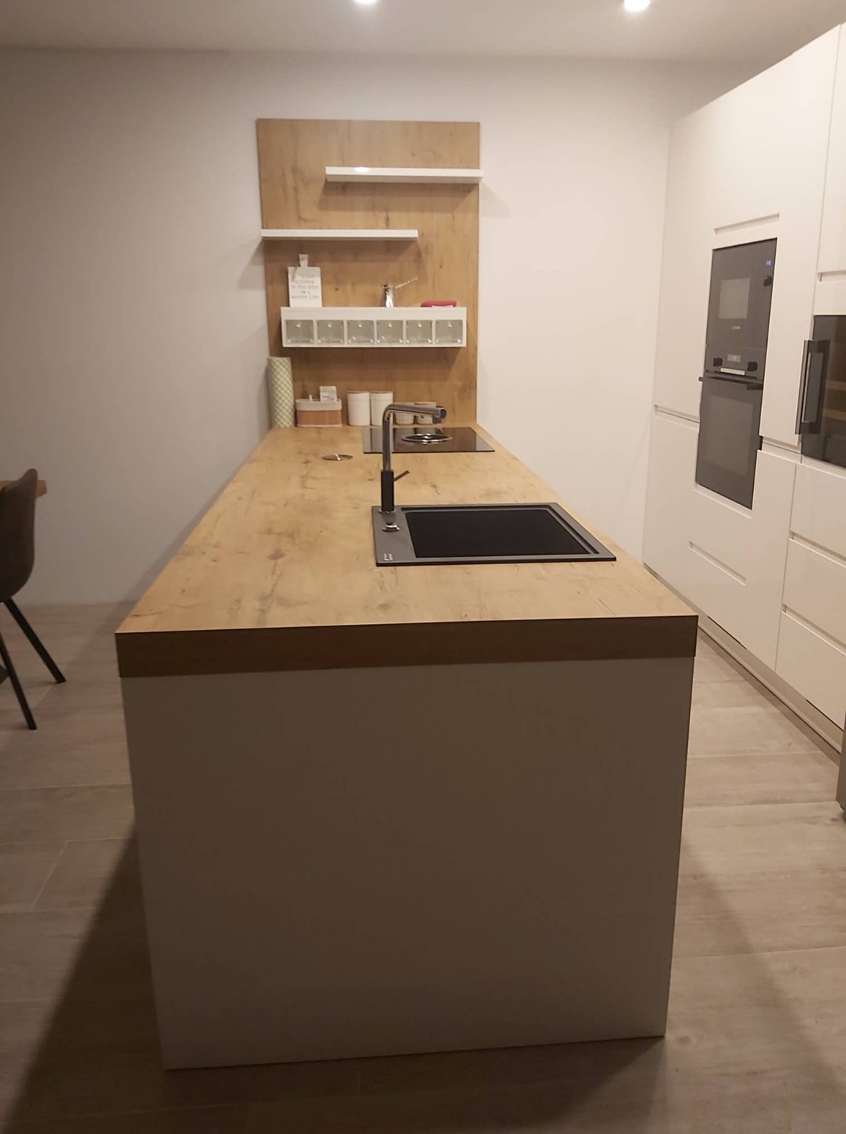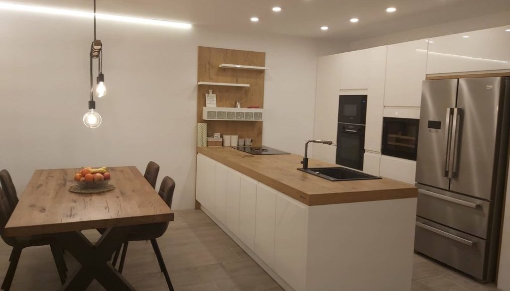 Stranka si je izbrala kombinacijo bele lak barve in naravnega lesa. Otok je postal tako središče kuhinje, kjer se dogajajo vse kulinarične umetnine. Bogat otok je opremljen z zelo kvalitetnim kuhališčem Bora, ki vsebuje vgrajeno napo. Poleg kuhališča je na otoku vgrajeno korito XL velikosti za nemoteno kuhanje kar na otoku. Po meri je narejena stena za shranjevanje začimb in ostalih pripomočkov, ki morajo biti vedno pri roki. Potopne vtičnice pa ne kradejo prostora na otoku, poskrbijo pa za nemoteno uporabo malih gospodinjskih aparatov na otoku.