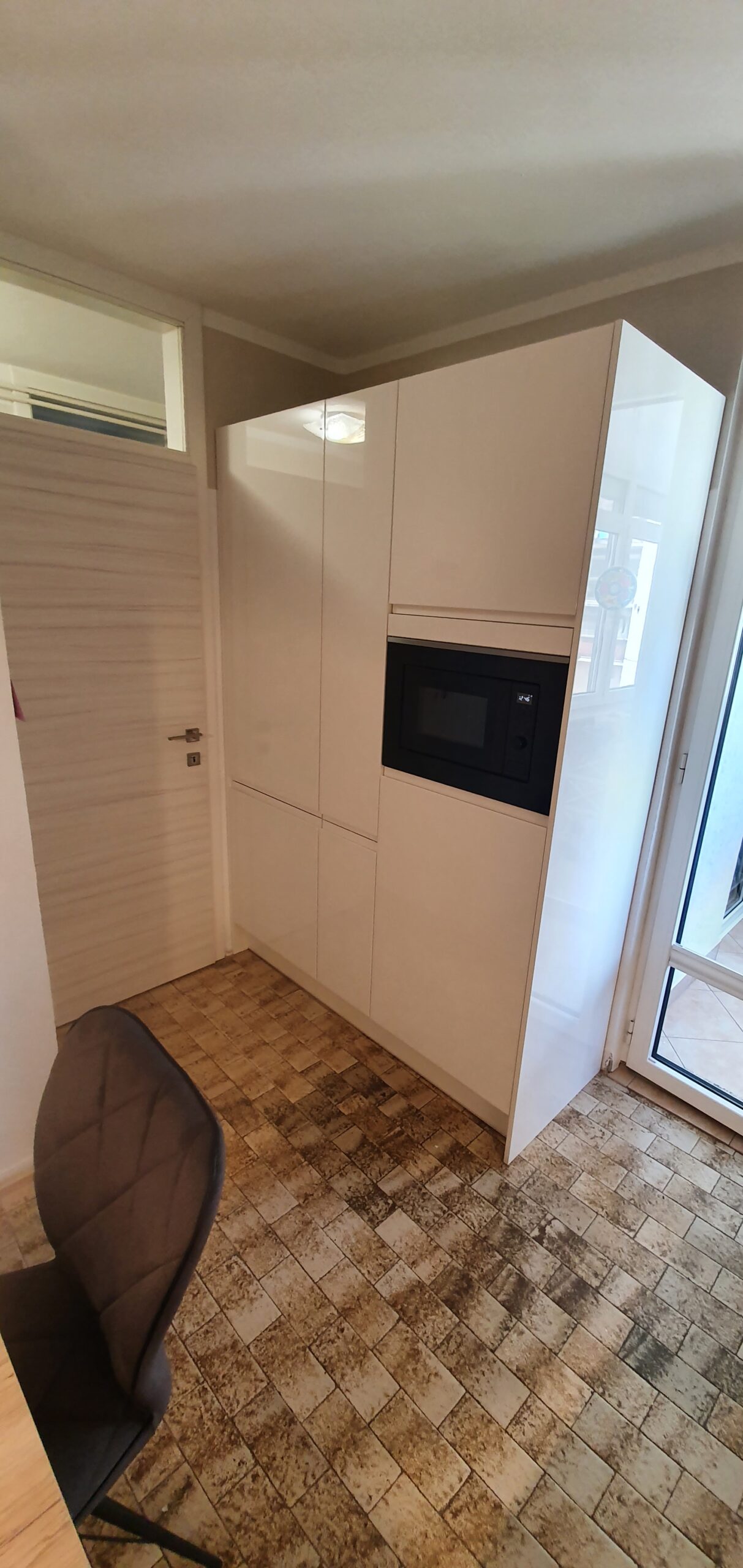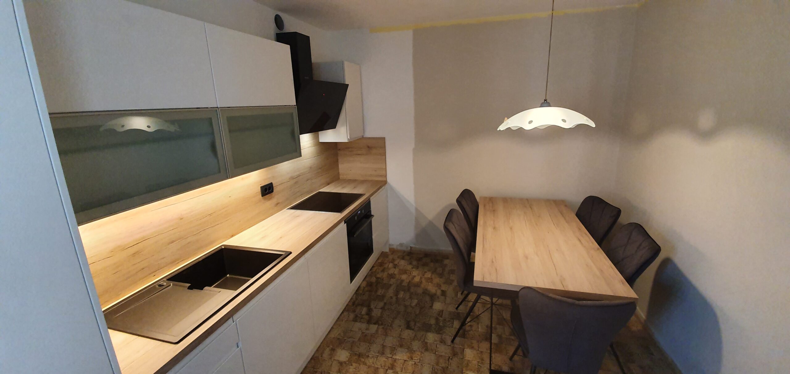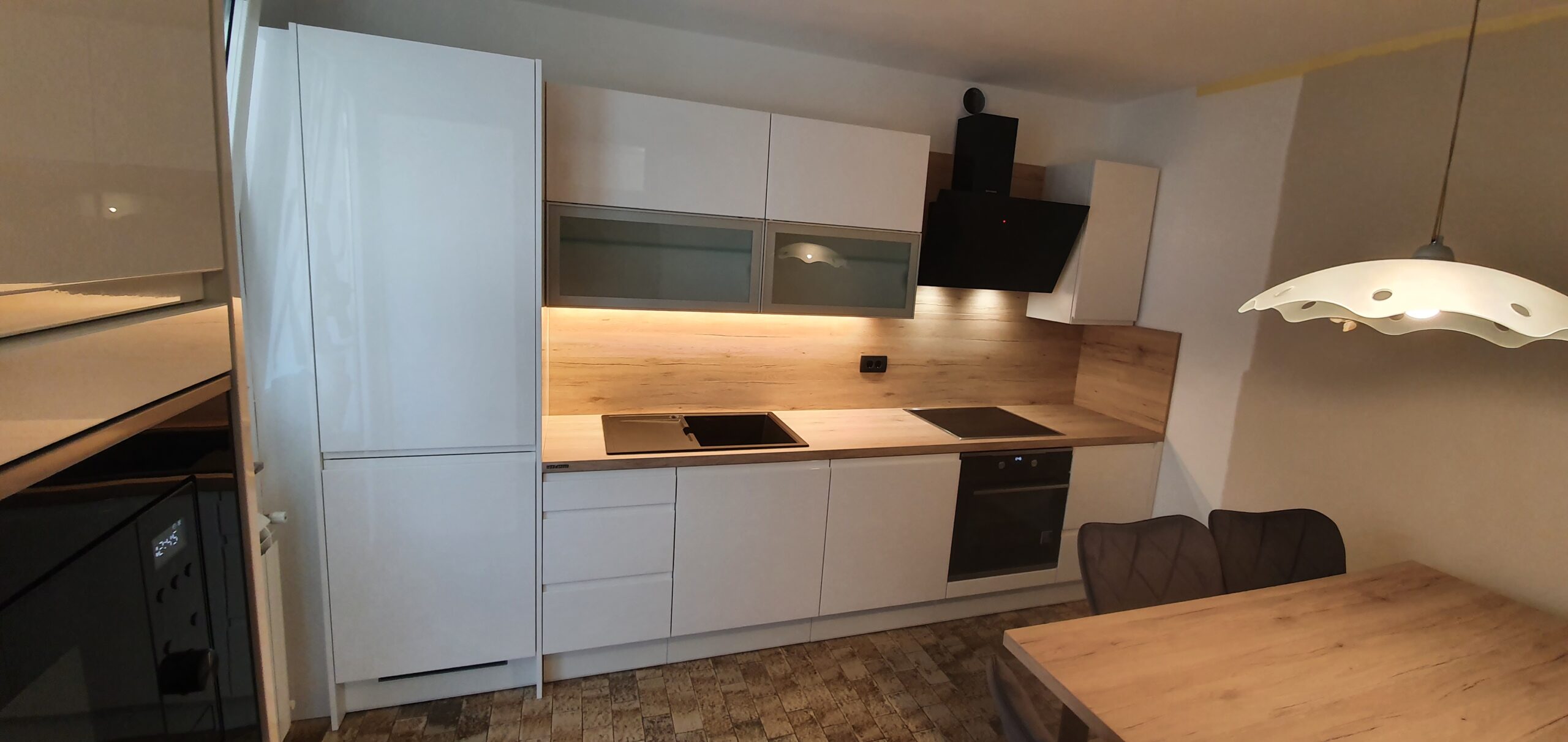 Predstavljamo projekt obnove kuhinje. Stranki smo montirali kuhinjo GRANADO v beli sijaj barvi. Kuhinjo smo dopolnili z veliko mizo po meri v barvi delovnega pulta kuhinje ULME in stoli. Seveda ne manjka tudi led razsvetljava. Visoke omare na drugi strani pa poskrbijo za res veliko shranjevalnega prostora.